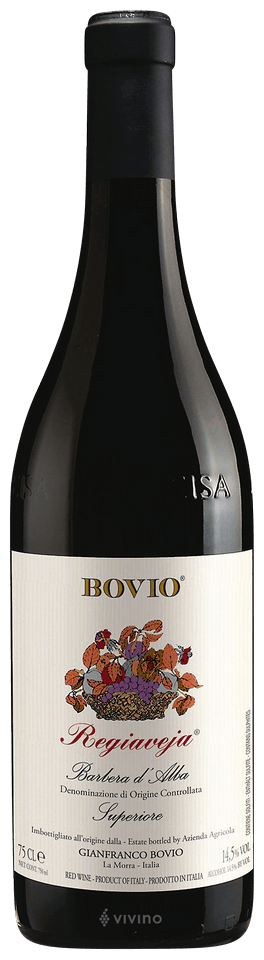 Bovios Barbera Superiore "Regiaveja" has a deep red color with violet hints. The aroma reveals notes of nuts and balsamic notes. The taste is very full-bodied but elegant, with a very long aftertaste thanks to the prominent acidity.